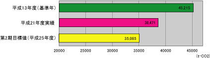 基準年度の温室効果ガス排出量(45,215t-CO2)に対し、平成21年度の温室効果ガス排出量は38,471t- CO2となり、6,744t-CO2、14.92%の削減でした。